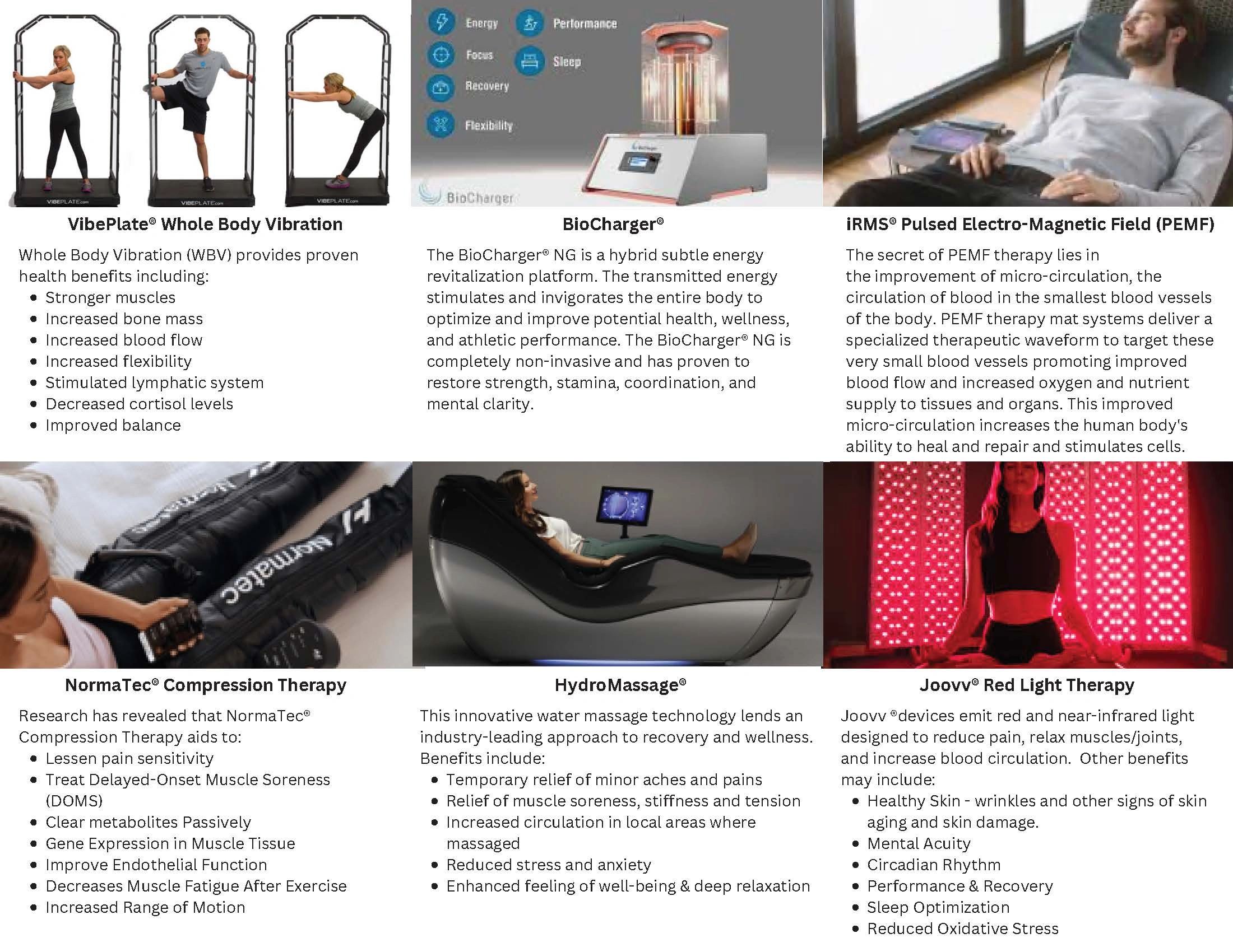 Card holders can pick three from the following modalities: VibePlate, PEMF, BioCharger, HydroMassage, Red Light Therapy, Normatec Compression Boots